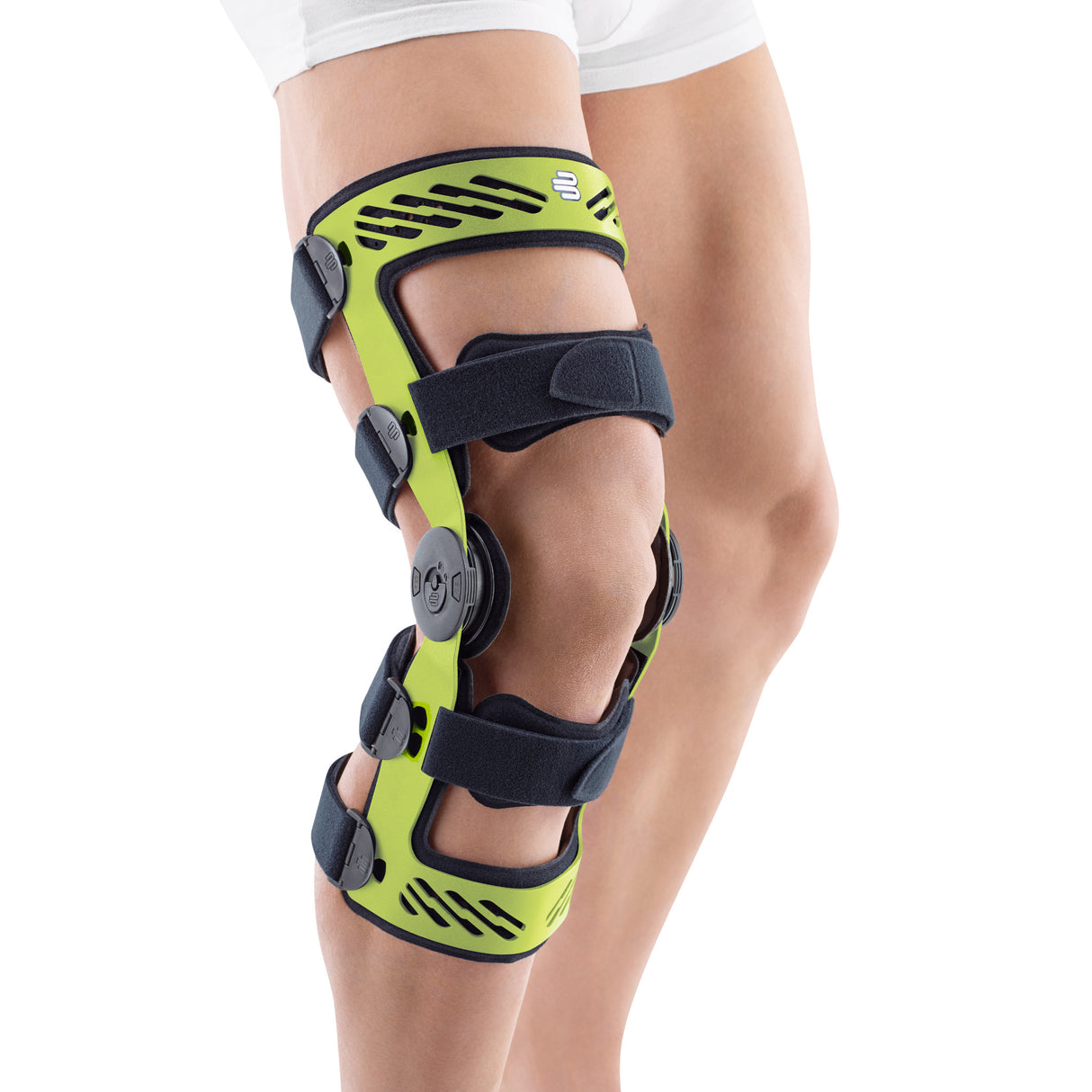 - Iespējams mainīt apakšējās, tuvāk locītavai esošās siksnas stiprinājuma augstumu, lai to pielāgotu apakšstilba formai.